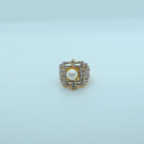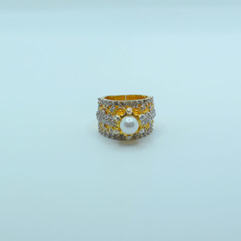 Gold Plated Zircon & Pearl Statement Ring – Adjustable