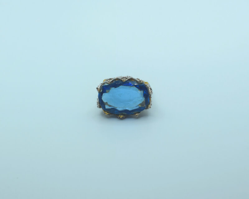 This 24k gold plated ring features a striking blue zircon stone at its center, cut in an oval shape that enhances its brilliance. The bold blue hue contrasts beautifully with the gold plated detailing, creating a standout piece.