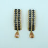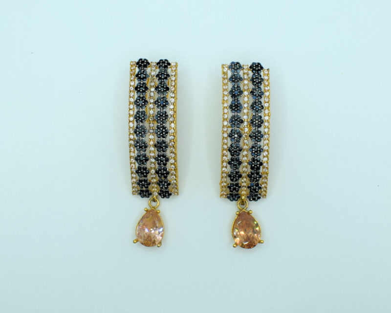 Striking earrings featuring black zircon rows with champagne drop stones in 24K gold plating. A bold and elegant addition to your collection.
