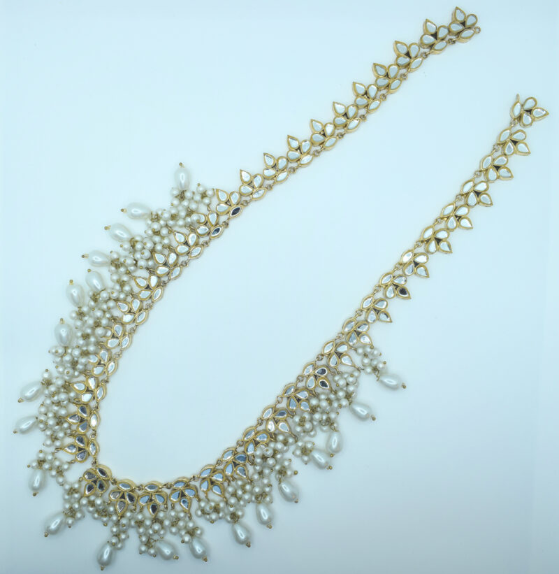 This Pearl & Zircon Long Haar Necklace – 24K Gold Plated radiates elegance and cultural beauty with its intricate droplet design. Perfect for brides who seek heritage sophistication, the necklace includes: