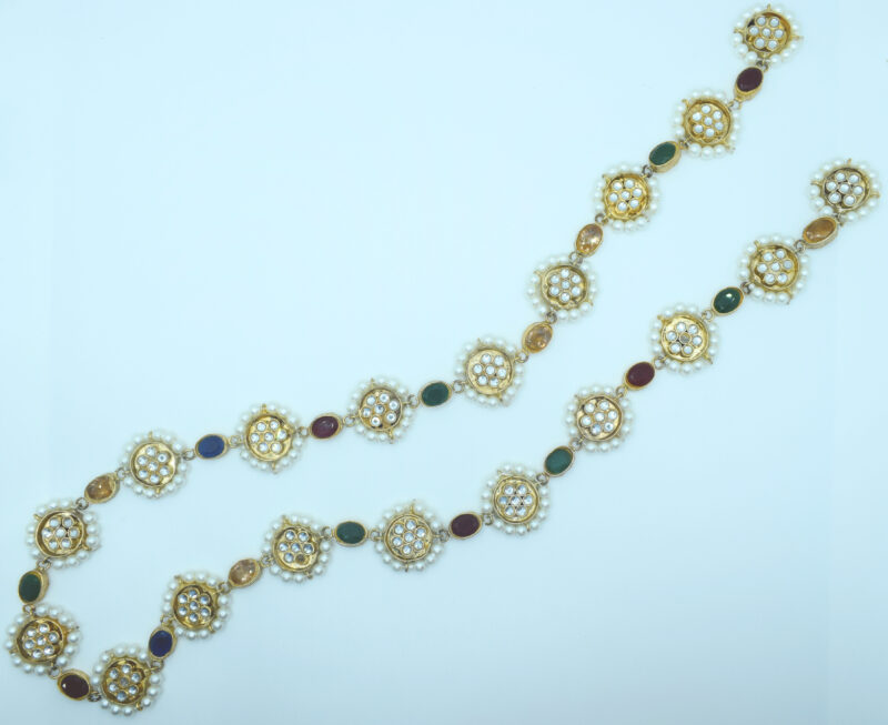 Design: A long haar crafted with alternating floral pearl motifs and multicolor stones in ruby red, emerald green, and golden accents.