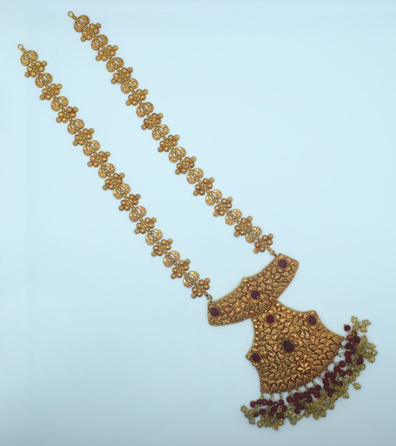Design: A long haar crafted with repeating floral links, leading to a bold pendant featuring ruby stone accents and intricate engraved detailing.