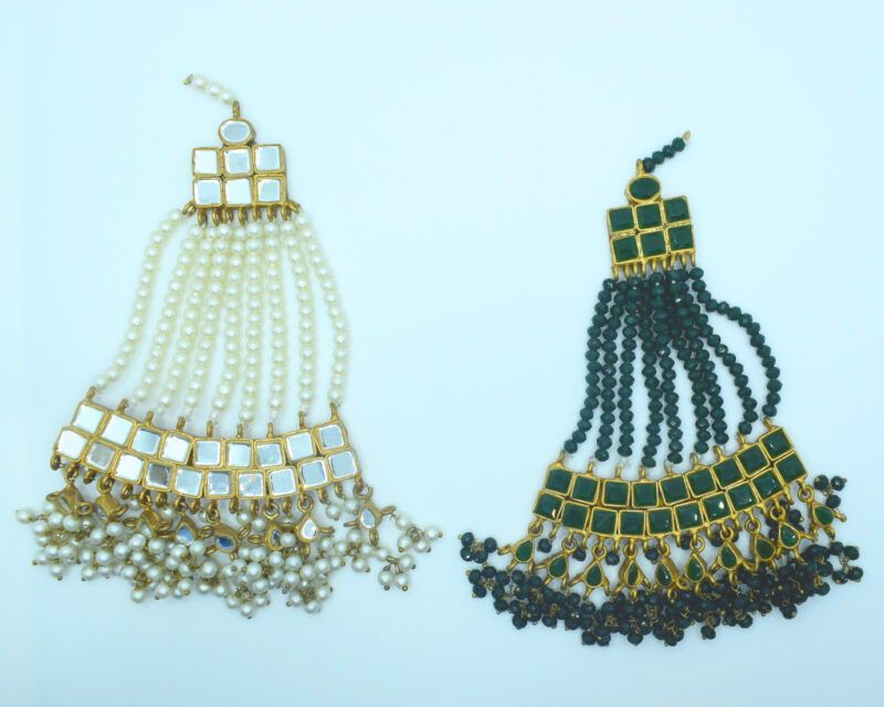 Design 1 (Left): White pearl strands with rectangular mirror-polish Kundan work, finished with delicate pearl tassels for a luminous bridal look.