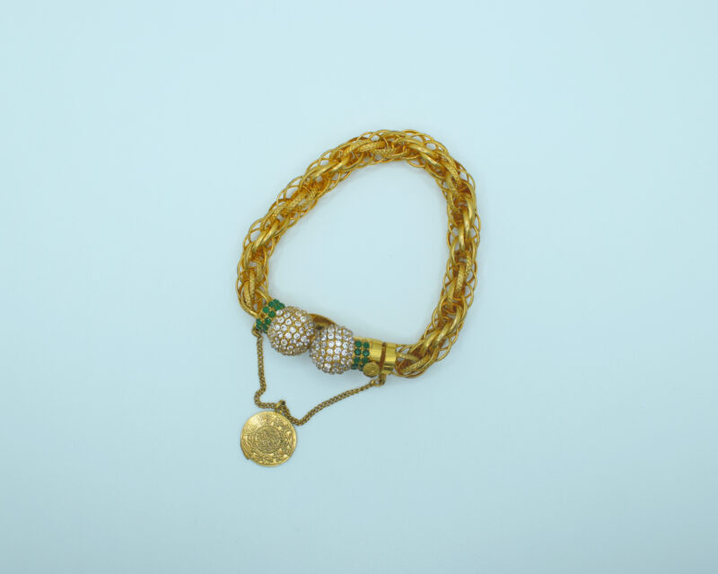 This 24K gold plated openable karra is crafted with emerald detailing and white stone accents, giving it a sophisticated traditional look. The secure clasp and attached coin charm add to its elegance and cultural value. Available in size 2.6, with customization options for other sizes as well.