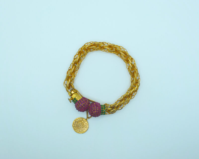 Moonz Jewellers presents a 24K Gold Plated Ruby Pearl Openable Karra with secure clasp and coin charm, embellished with ruby and pearl detailing.