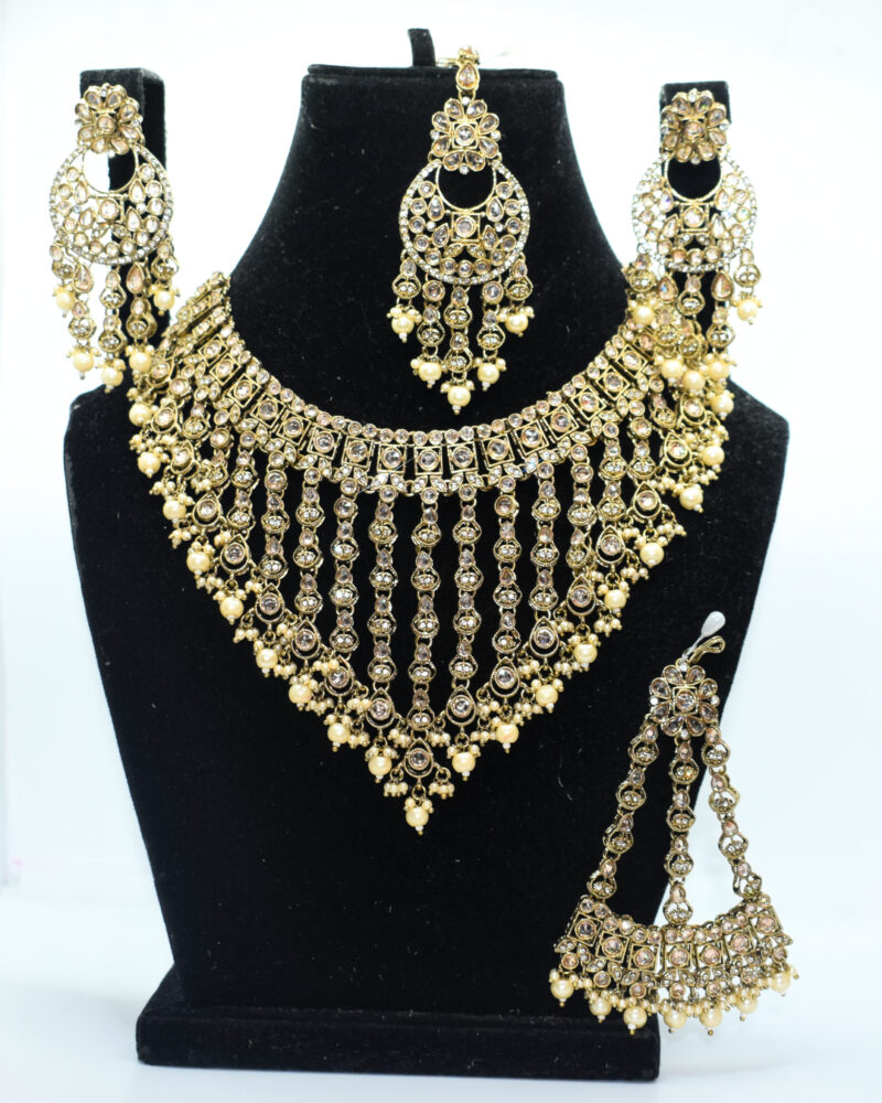 This 24K gold plated Polki Kundan bridal set features an elegant cascading necklace designed with rows of Polki Kundan stones and delicate pearl hangings. The long, layered design is perfectly paired with matching earrings and a coordinating tikka, making it a refined choice for weddings, receptions, and festive occasions.