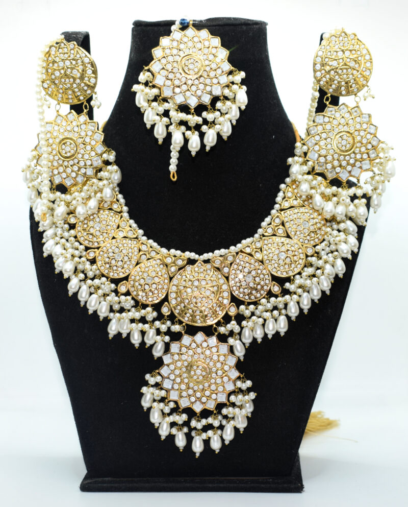 Thappa Kundan White Zircon Bridal Set – 24K Gold Plated with Pearls