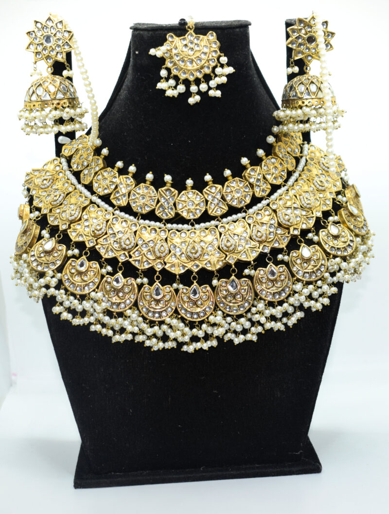 This 24K gold plated Thappa Kundan bridal set is crafted with traditional kundan artistry and adorned with elegant white pearl hangings. The bold choker-style necklace is enriched with crescent-shaped motifs, detailed kundan work, and multiple layers of pearls. Matching earrings and a coordinating tikka complete the regal design, making it perfect for bridal wear and wedding occasions.