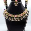 This 24K gold plated party wear set combines soft baby pink stones with traditional kundan work, creating a refined and elegant design. The necklace is adorned with clustered pearl hangings and matching earrings, offering a stylish yet graceful look for parties and festive gatherings.