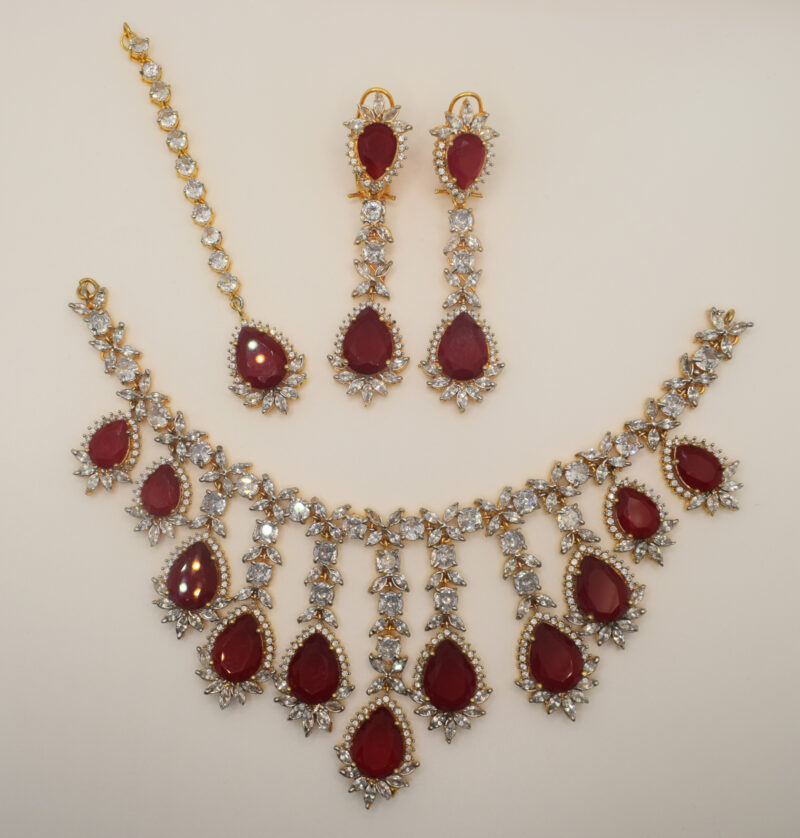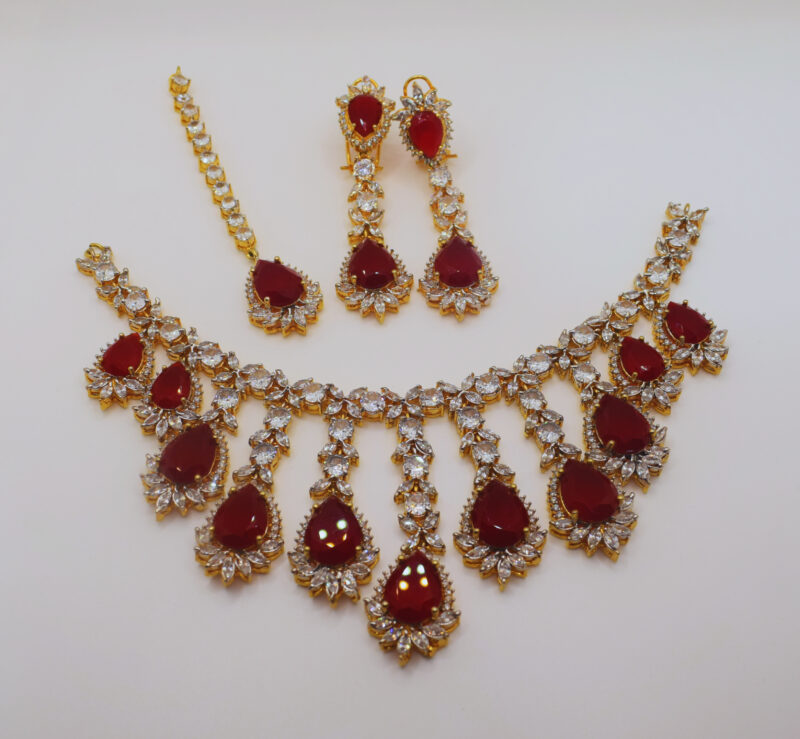 Necklace: Beautifully crafted with large red teardrop stones, surrounded by sparkling zircon accents and finished with a radiant 24K gold plating.