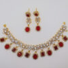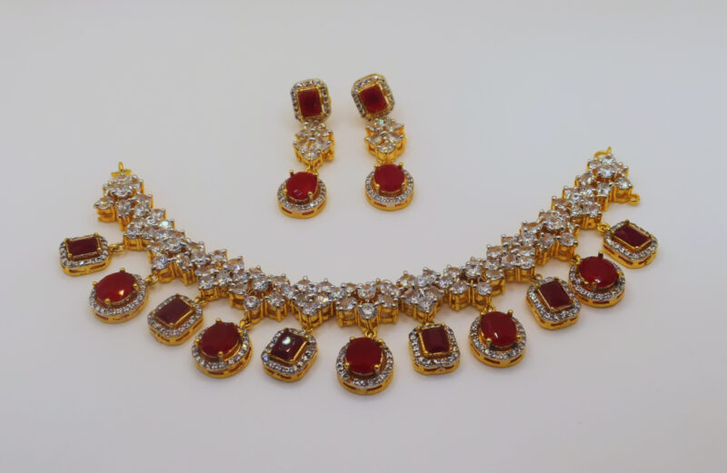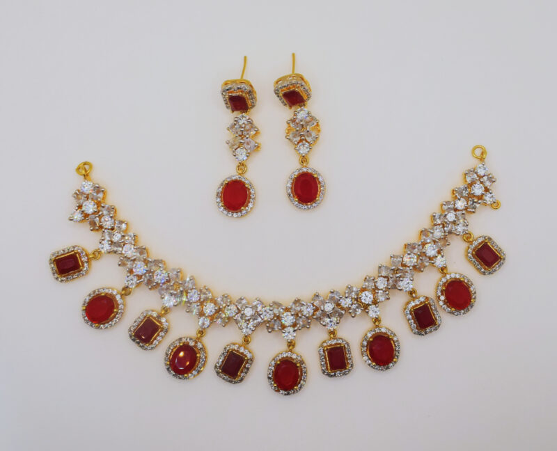 • Earrings: Coordinated earrings with ruby red oval stones and zircon detailing, offering a graceful balance to the necklace.