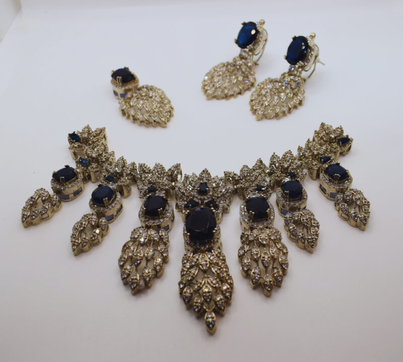 Necklace: A luxurious Kundan necklace featuring sapphire blue center stones framed by pavé zircon, arranged in cascading leaf-shaped elements for dramatic movement.