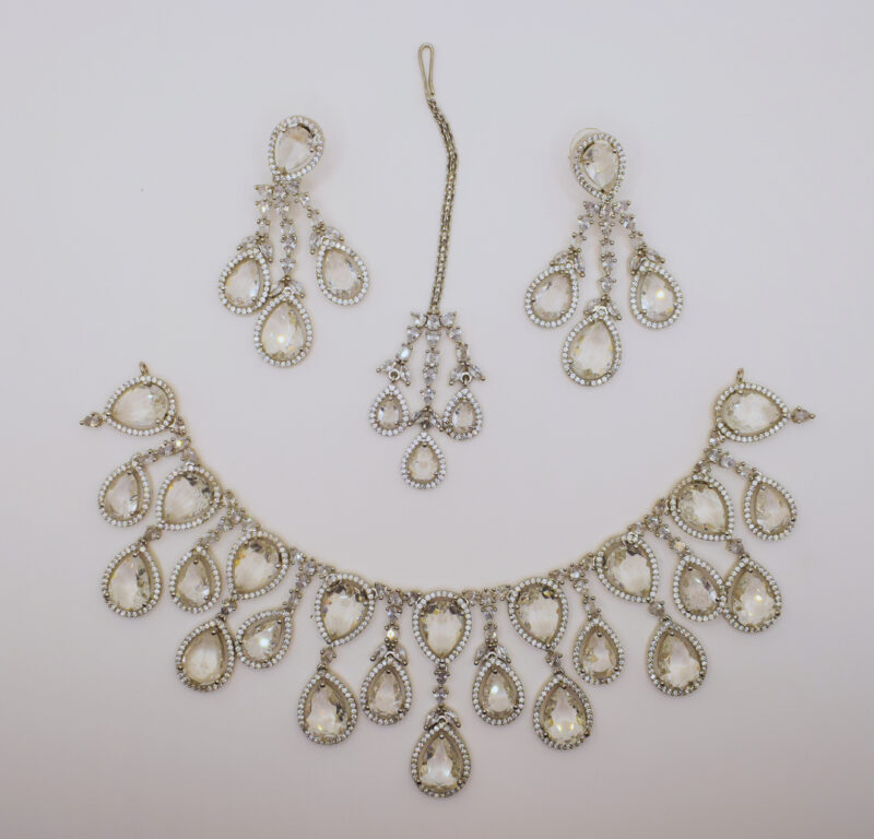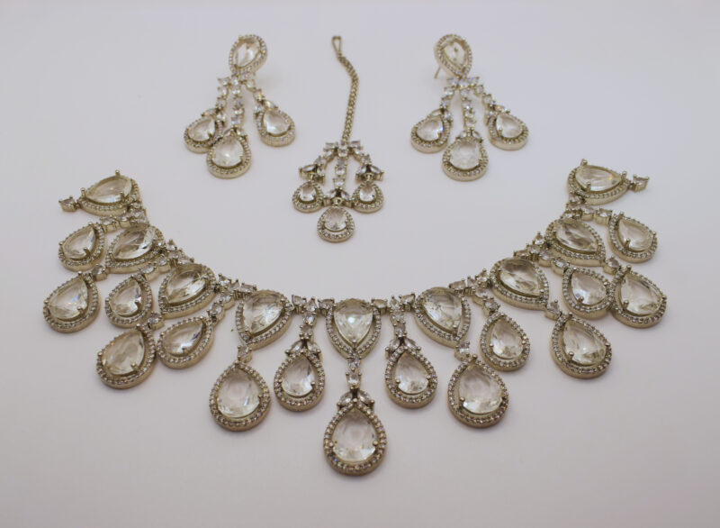 This bridal jewelry set symbolizes purity, brilliance, and grace, making it an exquisite choice for weddings, festive occasions, and cultural celebrations.