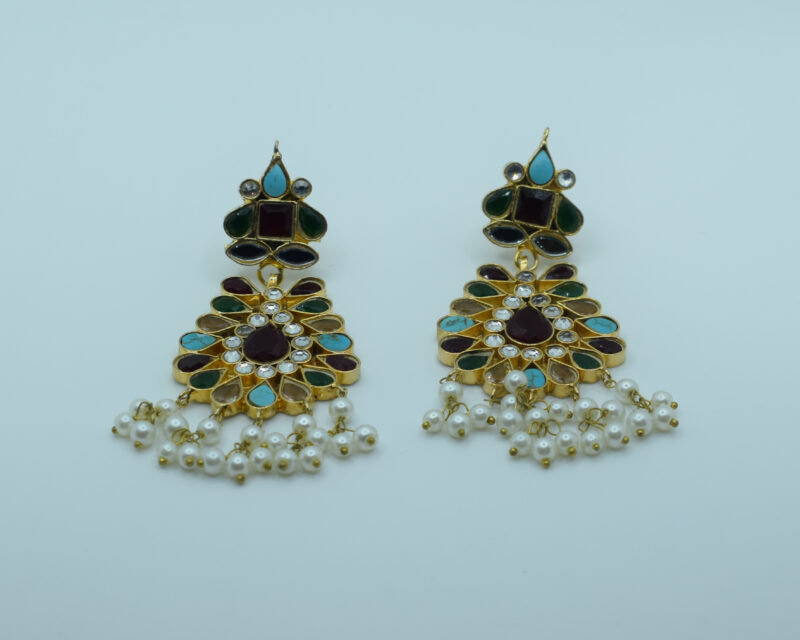 These earrings combine vibrant hues, intricate kundan work, and elegant pearls, making them a standout accessory for weddings, receptions, and cultural celebrations.