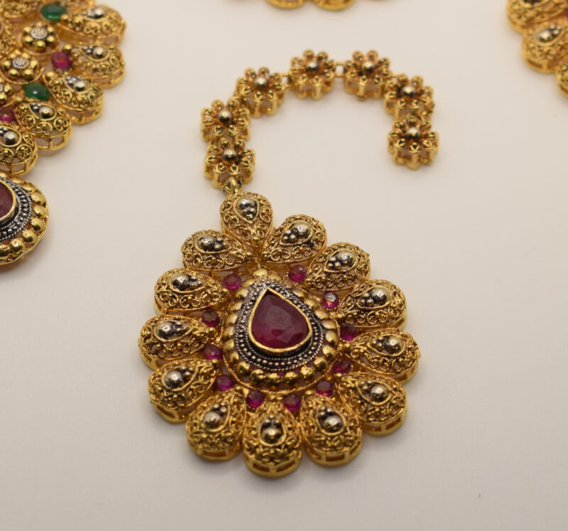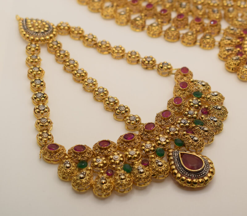 Elevate your bridal look with this Traditional Gold Bridal Jewelry Set, crafted with precision and adorned with red, green, and white stones. Designed to embody cultural richness and elegance, this complete set ensures you shine on your wedding day and festive occasions.