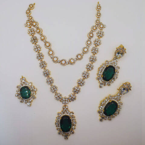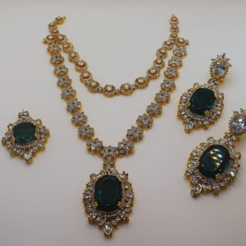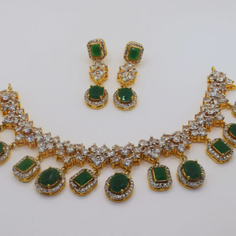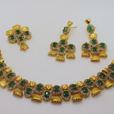 Green Stone & Zircon Necklace Set with Earrings and Pendant – 24K Gold Plated